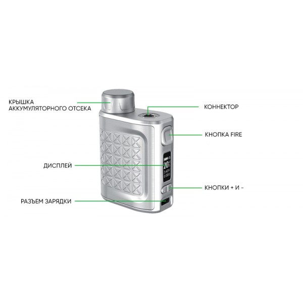 - Чтобы включить или выключить iStick Pico 2 быстро нажмите на кнопку Fire 5 раз.