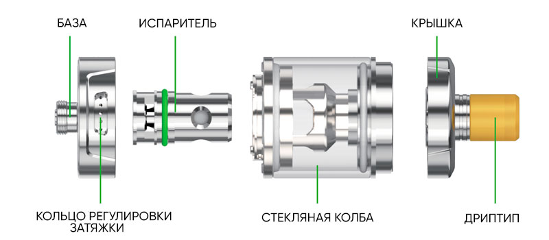 1. Извлеките из упаковки батарейный блок с атомайзером и испаритель.