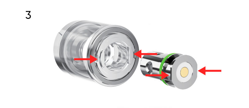 3. Извлеките испаритель из упаковки и вставьте его в отверстие снизу атомайзера. Обратите внимание, что испаритель может быть корректно установлен только в одном положении.