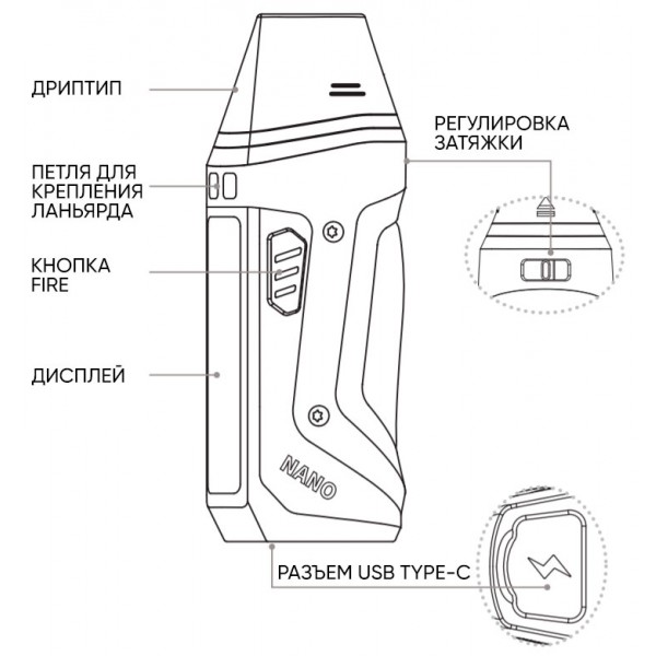 - Чтобы включить или выключить Geekvape Aegis Nano быстро нажмите на кнопку Fire 5 раз в течение 2 сек.