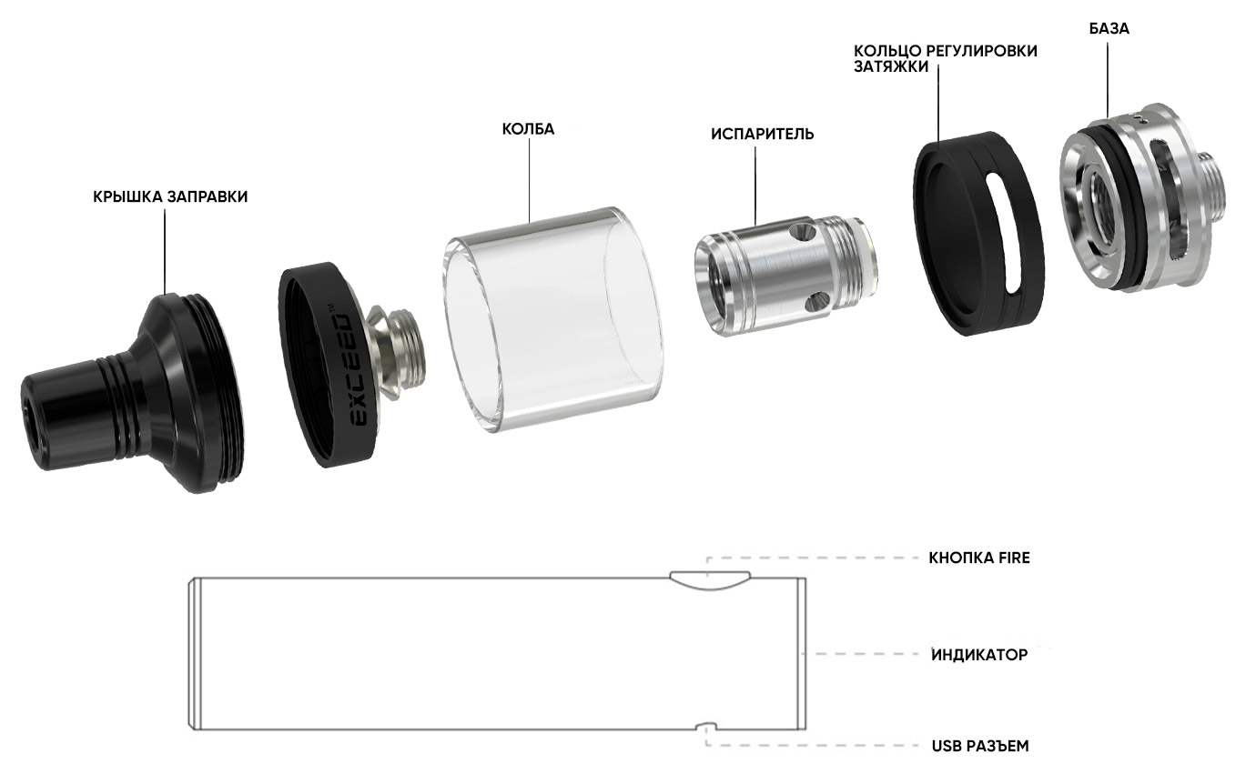 - Joyetech Exceed D19 не работает при нажатии на кнопку Fire, индикатор медленно мигает или быстро мигает 5 раз. Это связано с неисправностью испарителя. Убедитесь, что вы используете испаритель с сопротивлением не ниже 0.2 Ом и не выше 3.5 Ом. Проверьте правильность установки испарителя и сборки атомайзера. Если это не помогает, замените испаритель на новый.